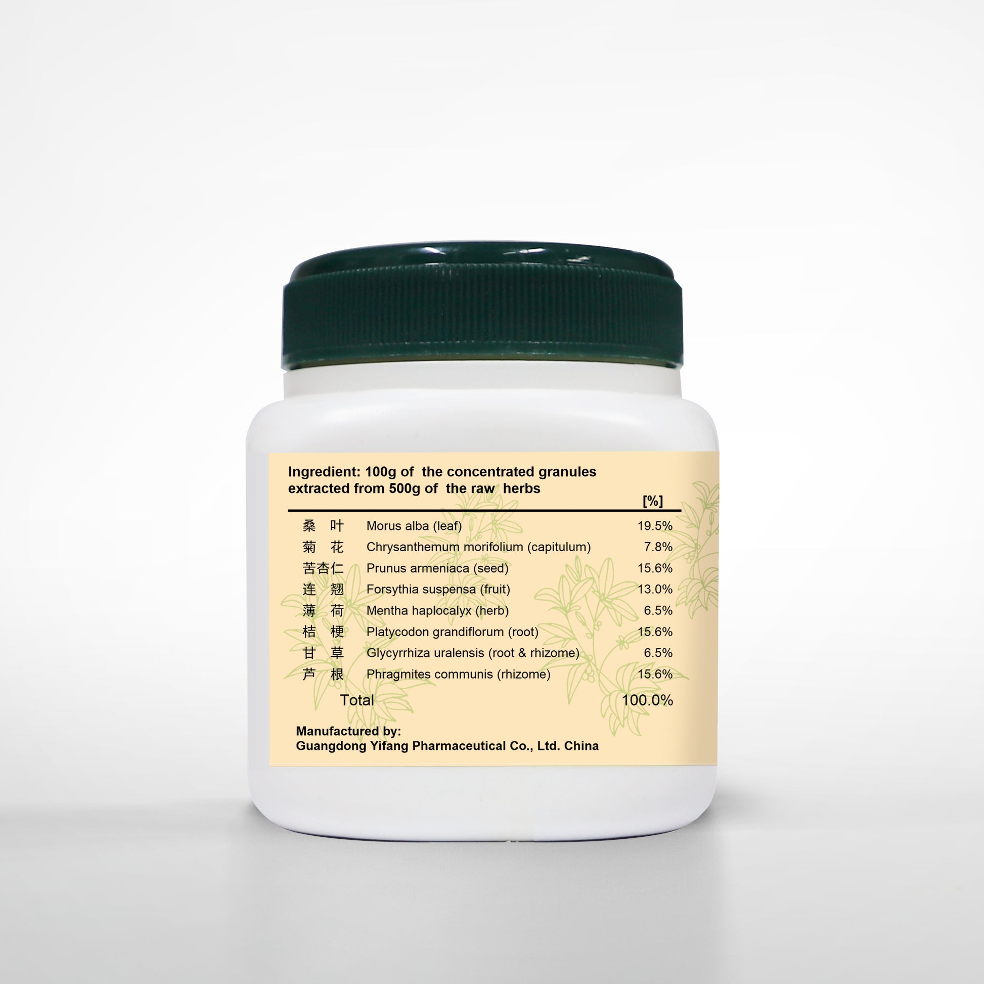 | Mori Folium (Sang Ye) 2.5 qian (7.5g) | Chrysanthemi Flos (Ju Hua) 1 qian (3g) |