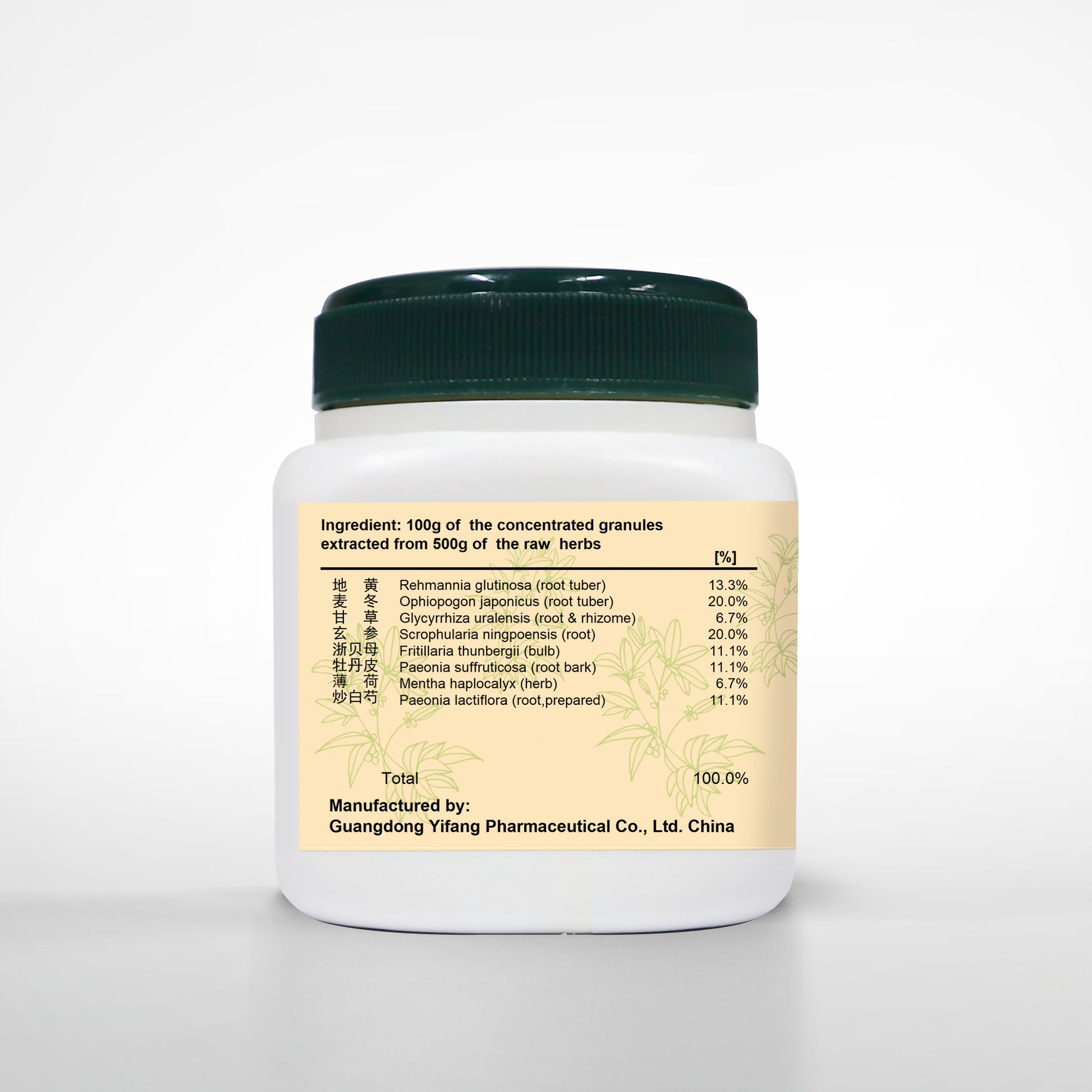 | Rehmanniae Radix (Da Sheng Di) 2 qian (6g) | Ophiopogonis Radix (Mai Dong) 1.2 qian (9g) |